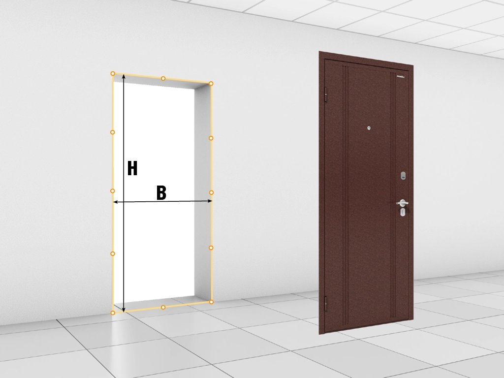 Замерьте высоту дверного проема (H) от выведенного, чистого пола. Для правильного замера необходимо знать точное положение нулевой отметки. Запишите минимальное значение.